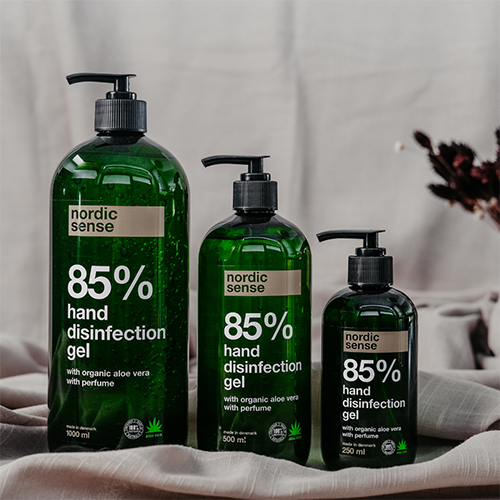 Hånddesinfektionsgel med fugtgivende glycerin og økologisk Aloe Vera, der nærer huden. Har en behagelig duft for at mindske lugten af alkohol. Godkendt til at bekæmpe både bakterier og virus. Produceret i Danmark 100% genanvendt flaske