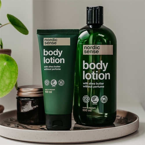 Nordic Sense bodylotion med fugtgivende, økologisk aloe vera og sheasmør. Den plejer huden uden at være fedtet og efterlader den blød og hydreret.